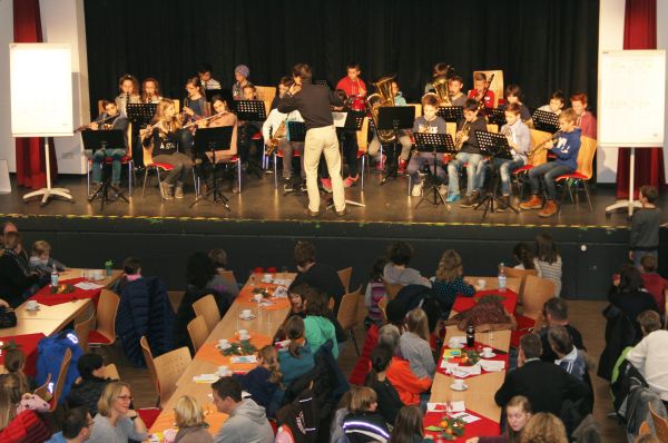 Die Vorführung eines Stückes von der Bläserklasse der Stufe 6 und ein Stand auf der Produktmeile im Foyer sorgten für Unterhaltung und Information rund um die Musik am ASG. |