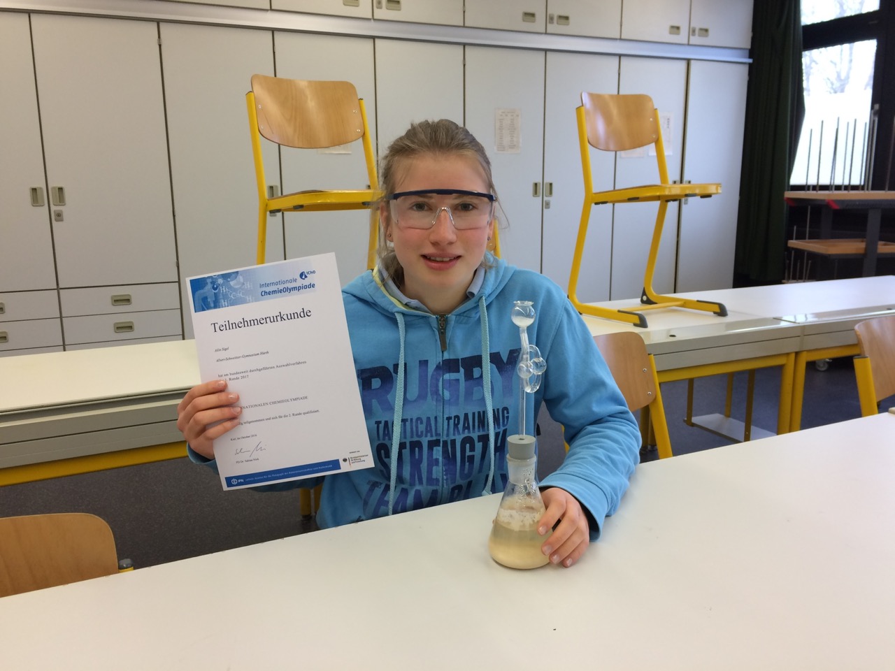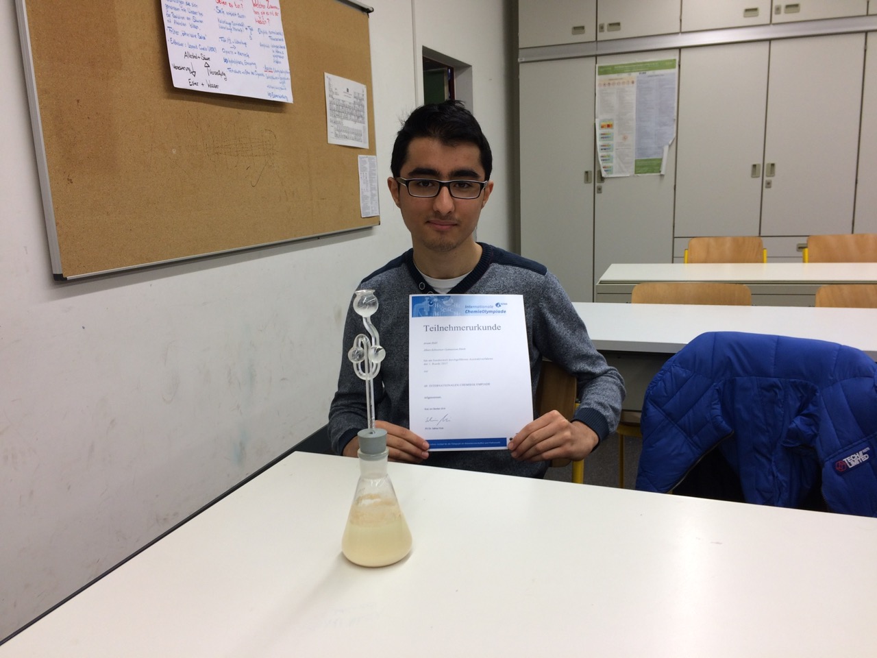 Auch in diesem Jahr nahmen Schülerinnen und Schüler unserer Schule an der Chemieolympiade teil. Arsam Halil (9a) gewann eine Urkunde - eine bemerkenswerte Leistung, wenn man bedenkt, dass sich der Wettbewerb an Oberstufenschüler richtet und teilweise sogar über den Schulstoff der Oberstufe hinaus geht. Ailin Sigel (Q1) konnte sich wie in den Jahren zuvor für die zweite Runde qualifizieren, in der eine Klausur auf dem Programm stand. Im Mai kommen die neuen Aufgaben für die erste Runde heraus. Alle Interessierten können sich bei ihrem Chemielehrer informieren.