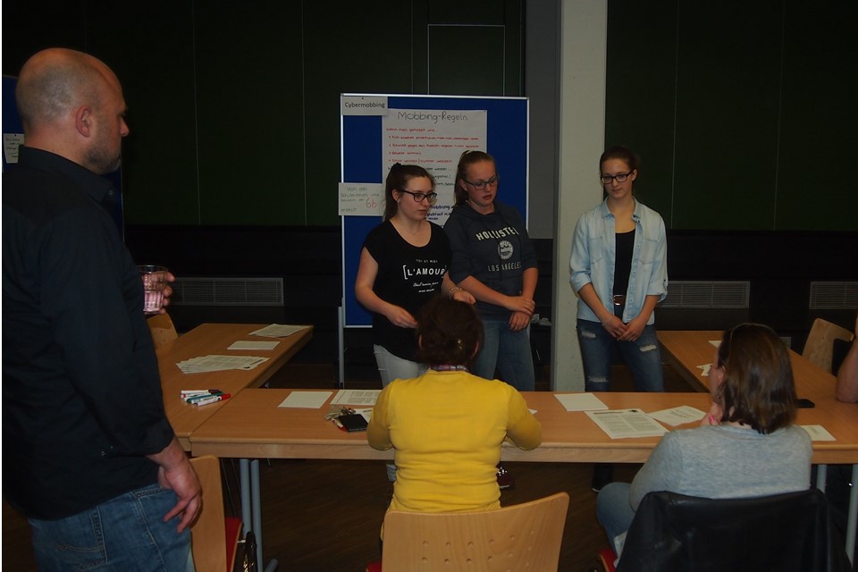 In der ersten Phase wurden 17 Schülerinnen und Schüler der Stufe 9 im Februar von dem Medienpädagogen Thomas Welsch von der sk-Stiftung Jugend und Medien zu Medienpaten ausgebildet: Eine intensive, lehrreiche und auch anstrengende Zeit in angenehm entspannter Atmosphäre im fünften Stock im Mediapark Köln. „Ich habe selber noch viel dazugelernt“, erzählte eine 9-Klässlerin nach der Ausbildung.