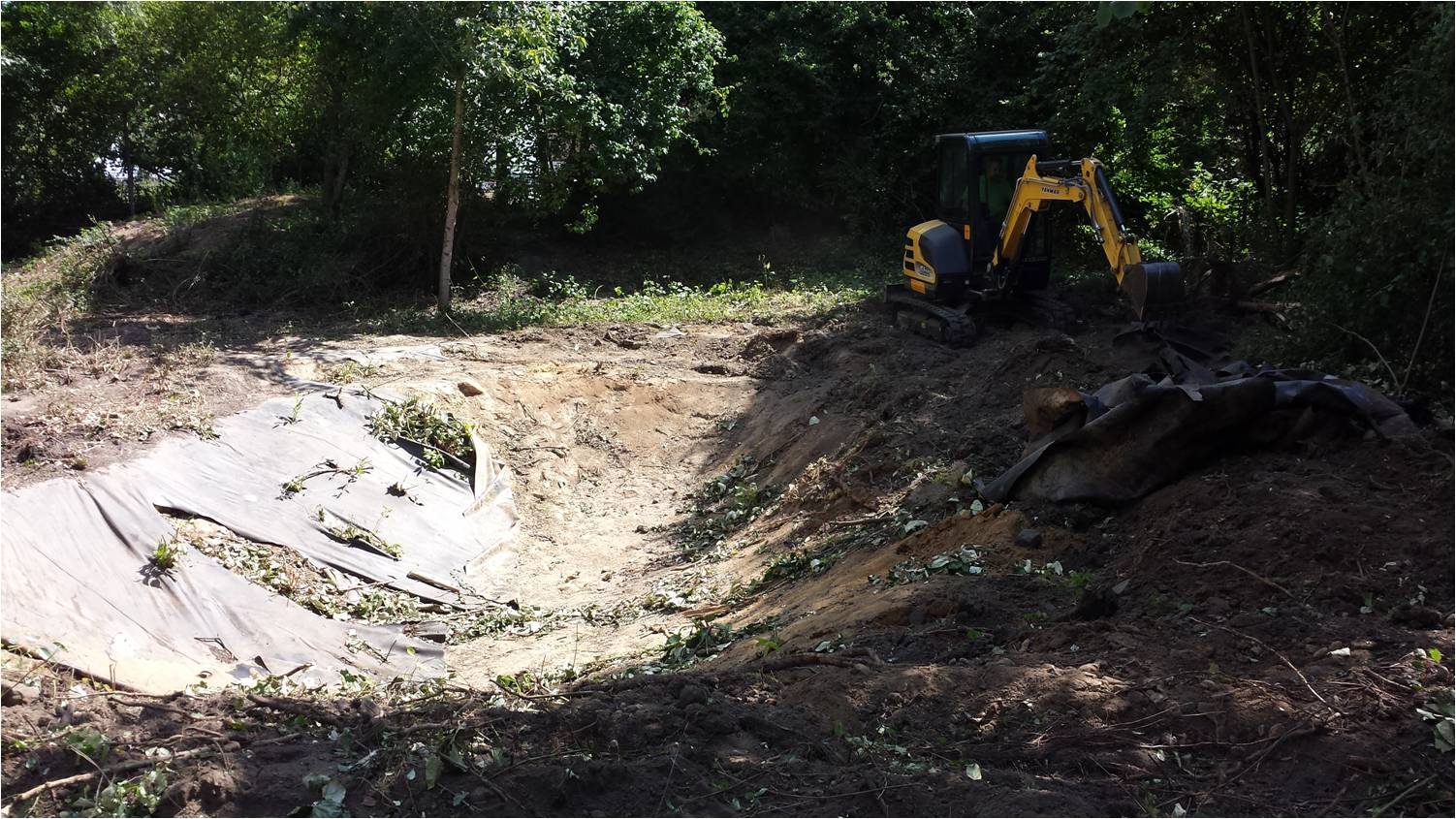 In den letzten Wochen vor den Sommerferien hat es in unserem Schulgarten einige wichtige Veränderungen gegeben. Mit der tatkräftigen Hilfe einiger Schüler und deren Eltern konnten wir einen ersten Freischnitt, der schon über Jahre verwilderten Flächen um den alten Teich, erreichen. Bei der Beseitigung von Sträuchern und kleineren Bäumen bemerkten wir, dass sich eine Vielzahl von Pappeln wild ausgesät hatten, die inzwischen zu stattlichen Bäumen herangewachsen waren. Mit ihrer Größe waren sie für uns als „Laien-Baumfäller“ nicht zu bewältigen. Da diese Bäume zu dicht am neu geplanten Teich gestanden hätten und eines der sehr großen Exemplare von einem Baumsachverständigen als Baum mit „unsicherem“ Wuchs eingestuft wurde, mussten sie zwangsläufig entfernt werden. Es bestand erheblicher Zeitdruck, da sich am Wochenende vor der letzten Schulwoche der Vater zweier Schüler des ASG, Herr Fallsehr, angeboten hatte uns mit seiner Firma „grüngrund“ für einen Tag fachliche und maschinelle Unterstützung zukommen zu lassen. Wir hatten bis zu diesem Termin nur zwei Wochen Zeit, um die Stadt Hürth von der Dringlichkeit der Abholzung zu überzeugen und konnten auf einen schnellen Termin zur Baumfällung nur hoffen. Dank des guten Kontakts von Herrn Schäfer zum Grünflächenamt war es glücklicherweise möglich, dass die Bäume vor dem besagten Wochenende gefällt und zerkleinert werden konnten. Ende Juni waren somit alle großen Hindernisse beseitigt, sodass sich ein Bagger der Firma „grüngrund“ durch unseren Schulgarten arbeiten konnte. Bei den ersten Planungsgesprächen konnten wir noch nicht erahnen, wie viel wir an einem solchen Arbeitstag erreichen könnten. Letztendlich hat eine zehnstündige Baggerfahrt dazu geführt, dass Büsche und Bäume samt ihrer Wurzeln entfernt werden konnten, die gesamte Folie des alten Teiches entsorgt wurde und das gesamte Areal begradigt werden konnte.