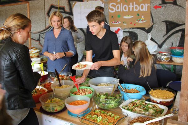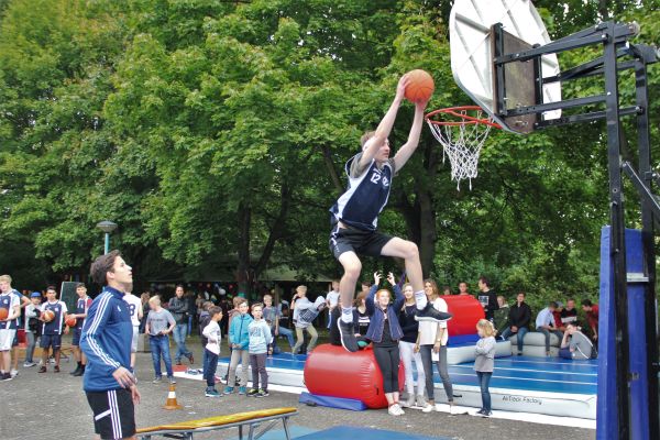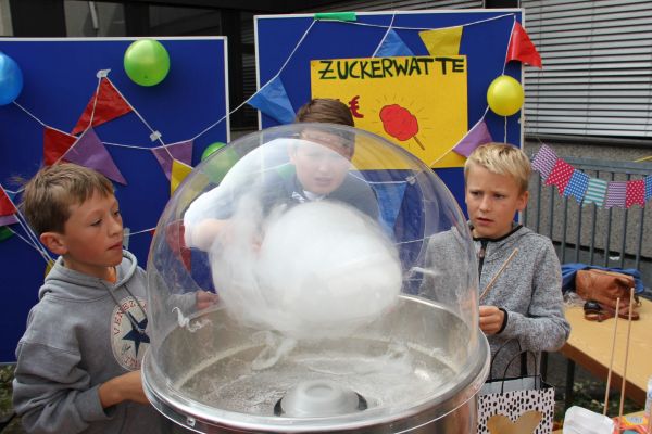 Lange vorher hatten die Klassen mit ihren Lehrerinnen und Lehrern - und auch unter Mithilfe vieler engagierter Eltern - ein buntes Programm zusammengestellt, das die Gäste bis in den Nachmittag hinein bestens unterhalten hat. Unter anderem gab es Dosen- und Luftballonwerfen, Torwandschießen und Sackhüpfen sowie weitere sportliche Aktivitäten. Kniffelig war es am Stand der Klasse 9e, wo es Lehrergesichter anhand von Fotos älteren Datums zu erkennen galt. Im Rahmen der Inklusion an unserer Schule konnten Schülerinnen und Schüler im wahrsten Sinne des Wortes "erfahren", wie man sich mit dem Rollstuhl fortbewegt. Für künstlerische Unterhaltung sorgten diverse Musikensembles des ASG, deren abwechslungsreiche musikalische Untermalung das leckere Essen gleich noch besser schmecken ließ. Und hiervon gab es reichlich; von Würstchen mit Salaten über internationale Speisen und Hotdogs bis Paella. Wem der Sinn eher nach etwas Süßem stand, konnte sich mit reichlich Kuchen, Eis oder Zuckerwatte verwöhnen.