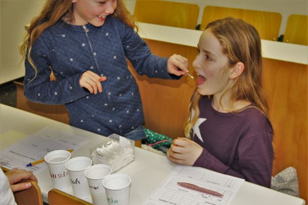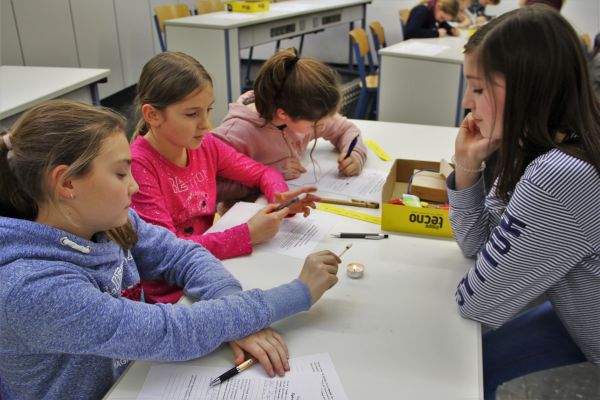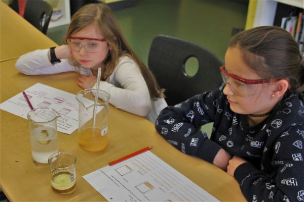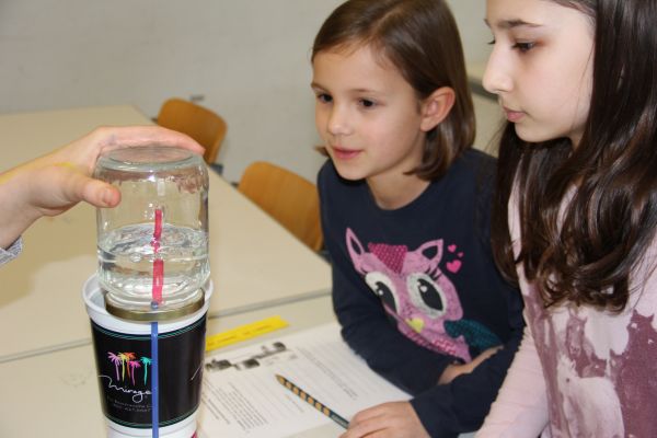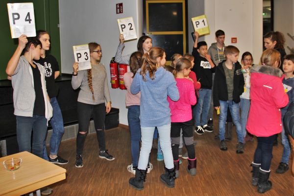 Viele Grundschülerinnen und Grundschüler waren mit ihren Eltern gekommen und wurden zunächst in der Aula von der Schulleitung, der Unterstufenkoordination und der Leitung des NIM-Schwerpunktes begrüßt und über den Ablauf des Nachmittags informiert. Mittelstufenschüler und -schülerinnen führten sie anschließend in die Naturwissenschaftsräume, wo physikalische, biologische und chemische Versuche und Experimente durchgeführt werden konnten. Dabei ging es unter anderem um die Beantwortung der Fragen "Wo ist das Spiegelbild?" und "Weg oder nicht weg?". Auch alltäglichen Dingen wie "Der Puls" und "Geschmack und Geruch" konnte auf den Grund gegangen werden. Dagegen waren Phänomene wie "Die chemische Zunge", der Zusammenhang zwischen "Kaugummi und Feuermelder" als auch "Die schwebende Kartoffel" wohl neu für die Kinder.