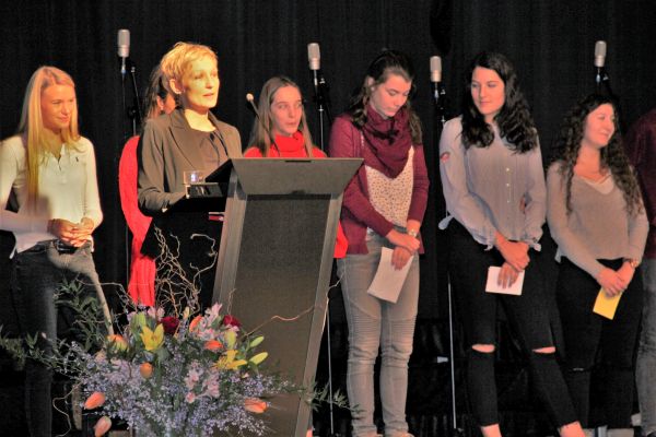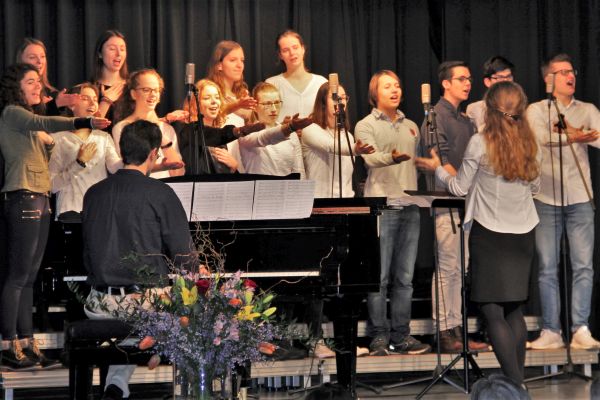 Die "Young Star Voices" eröffneten die Veranstaltung in der Aula, Guido Bösader ehrte Alfred Schäfer als Kollege und Freund. |