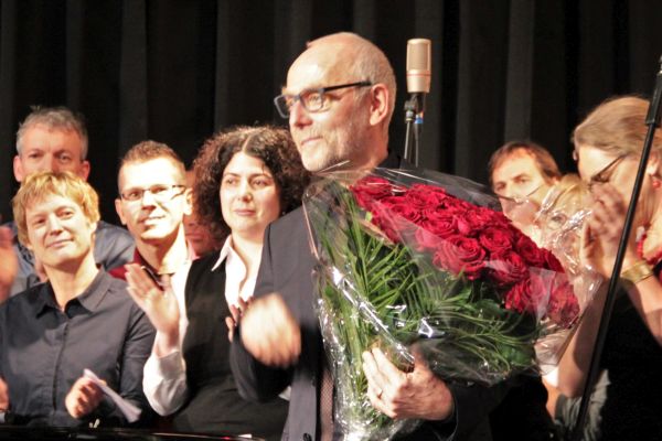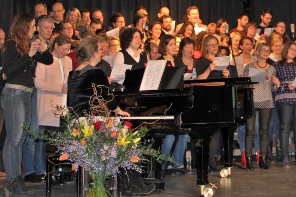 Den Abschluss der feierlichen Veranstaltung machte der erweiterte Lehrerchor, in dem Alfred Schäfer selber jahrelang Mitglied war. Beim Vortrag der umgetexteten Köln-Hymne "Mer han e Hätz för Alfred" übermannten die Emotionen nicht nur den Geehrten, sondern auch viele im Chor und im Publikum. Das Kollegium bedankte sich bei Alfred Schäfer mit einem Strauß von 37 Rosen für die 37 Jahre am ASG. Beim anschließenden Sektempfang wurden dann noch viele Hände geschüttelt, Gespräche geführt und Dank und Glückwünsche ausgesprochen.