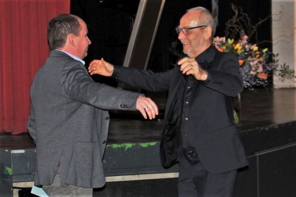 Anschließend folgten Abschiedsworte von Schulleiterin Birgit Willenbrink. Sie wies darauf hin, dass es auf den Tag genau 37 Jahren her war, dass Alfred Schäfer seinen Dienst am ASG antrat, und dankte ihm für seinen unermüdlichen Einsatz für die Schule. Die Überreichung der Entlassungsurkunde markierte dann ganz offiziell das Ende seiner Zeit als Lehrer und stellvertretender Schulleiter. Dass dies kein einfacher Schritt für Alfred Schäfer war, merkte man ihm in seinen abschließenden Worten an die Schulgemeinde an. Immer wieder unterbrochen von Applaus, verlieh er seiner tiefen Dankbarkeit für die Zeit an seiner Schule Ausdruck und betonte, dass ihm in erster Linie das Wohl der Schülerinnen und Schüler am Herzen lag. Das Zitat von Albert Schweitzer, "Jeder Mensch geht uns als Mensch etwas an", habe ihm dabei immer als Richtlinie für sein Handeln gedient. Abschließend hob er noch einmal hervor, wie er das Zusammenspiel aller am Schulleben Beteiligten immer gesehen hat, nämlich als ein "Wir am ASG", und gab in diesem Sinne Kollegen, Eltern und Schülern seine guten Wünsche mit auf den Weg. Tosender Beifall und stehende Ovationen waren Ausdruck von Dankbarkeit und Wehmut auf beiden Seiten.