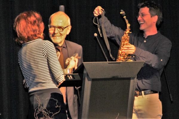 Schulpflegschaftsvorsitzende Uschi Mönch bedankte sich für die gute Zusammenarbeit zwischen Eltern und Schule und überreichte Alfred Schäfer zusammen mit Christoph Grüner ein Saxofon. |