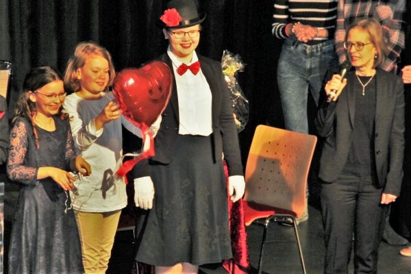 Die Mittelstufentheater-AG besteht, wie sich der Bezeichnung entnehmen lässt, aus Schülerinnen und Schülern der Klassen 7 bis 9. Es war schon erstaunlich, wie professionell sie in ihrem jungen Alter das Stück auf die Bühne brachten. Besonders beeindruckend waren natürlich die Gesangseinlagen, die von den Hauptdarstellerinnen und -darstellern dargebracht wurden. Aber auch die schauspielerische Leistung überzeugte, denn viele der jungen Schauspieltalente übernahmen gleich mehrere Rollen.