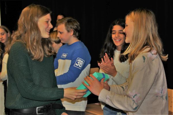 Danach wurde es spannend. Die drei Jurymitglieder hatten sich auf drei Drittplatzierte, zwei Zweitplatzierte und eine Siegerin geeinigt. Ada, Lorenz und Eva erzielten den dritten Platz, Manelie und Connor landeten auf Platz zwei. Die strahlende Siegerin hieß Enie Markus, die voller Freude und Stolz das Lob der Jury, den Applaus des Publikums und ein vom Förderverein gesponsortes Buchgeschenk in Empfang nahm. Sie wird das ASG nun beim Regionalwettbewerb vertreten.