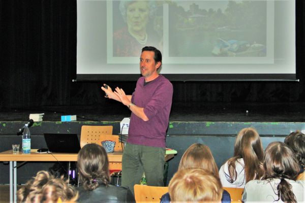 David Fermer las Passagen aus drei Kapiteln vor, veranschaulichte Fakten und Zusammenhänge immer wieder mit Bild- und Filmmaterial und band auch die Schülerinnen und Schüler in vielfältiger Weise mit ein. Das kam gut an, die Schüler gingen auf Fragen ein, stellten selber welche und gaben auch später im Unterricht ein sehr positives Feedback. So gelang es David Fermer, die Schülerinnen und Schüler auf ein emotional aufgeladenes und aktuelles Thema hinzuweisen, aber auch für das Lesen englischer Literatur zu begeistern. Am Schluss überließ er der Schule noch einige seiner Werke, darunter auch das von ihm vorgestellte Buch. Einige Schülerinnen und Schüler haben bereits Interesse signalisiert, es im Unterricht oder privat zu lesen.