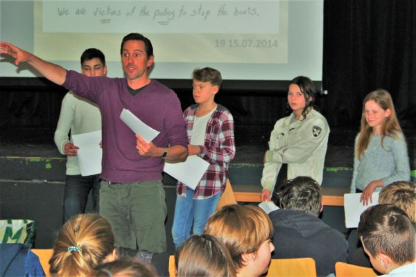 Englischunterricht einmal ganz anders gab es am 7. Mai für die Klassen der Jahrgangsstufe 8. Zum dritten Mal war der britische Buchautor David Fermer zu Gast am ASG, um den Jugendlichen eines seiner Werke vorzustellen. Beginnend mit einem anschaulichen Überblick über sein Leben in England und Deutschland, die Schwierigkeiten beim Lernen der deutschen Sprache und die Zeit, als er selber Schüler war, widmete er sich in seiner Buchpräsentation einem aktuellen Thema: Flüchtlinge.