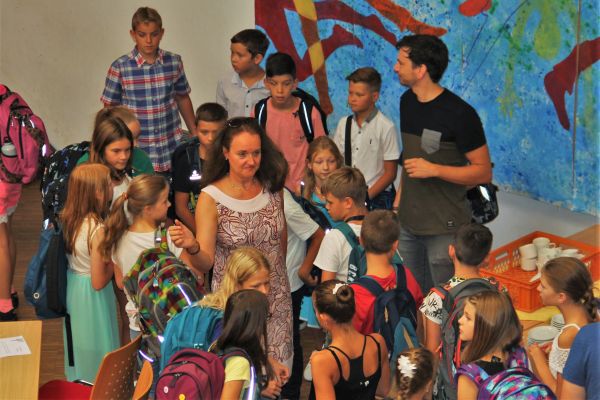 Nach der Begrüßung - auch im Namen der Erprobungsstufenkoordinatorinnen Frau Bösader und Frau Bieker - teilte Herr Jürgensen-Engl die Schülerinnen und Schüler ihren neuen Klassenlehrerinnen und -lehrern zu, mit denen sie bereits am Kennenlernnachmittag Ende des letzten Schuljahres Zeit verbracht hatten. Gemeinsam gingen sie in die Klassenräume, um dort ihre erste Unterrichtsstunde am Gymnasium zu erleben, Stundenpläne zu erhalten und sich für die ersten Tage an der neuen Schule bereit zu machen. Für die Eltern war währenddessen Zeit für einen Kaffee und Gespräche mit Frau Bösader und Frau Bieker, die viele Fragen beantworteten und Tipps gaben. So ging der aufregende erste Schultag zu Ende.