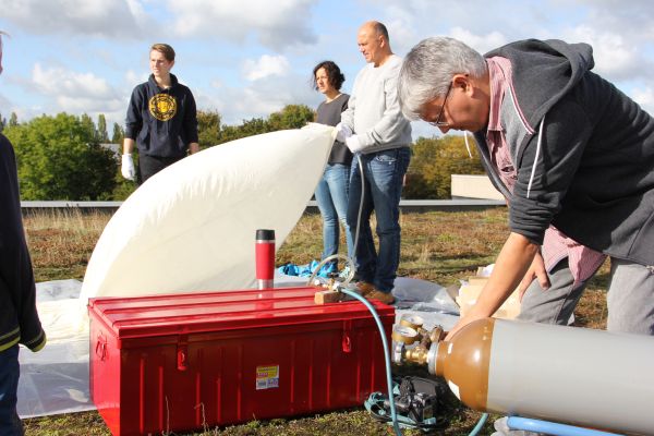 Schüler- und Lehrerschaft schauten begeistert zu, wie sich der Ballon ausdehnte und formschön in den Himmel ragte. |