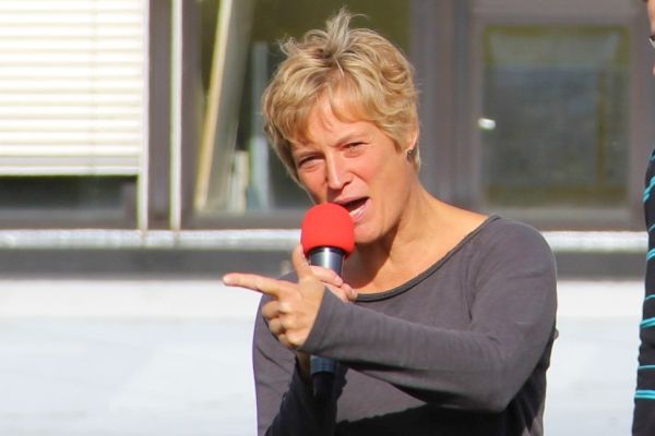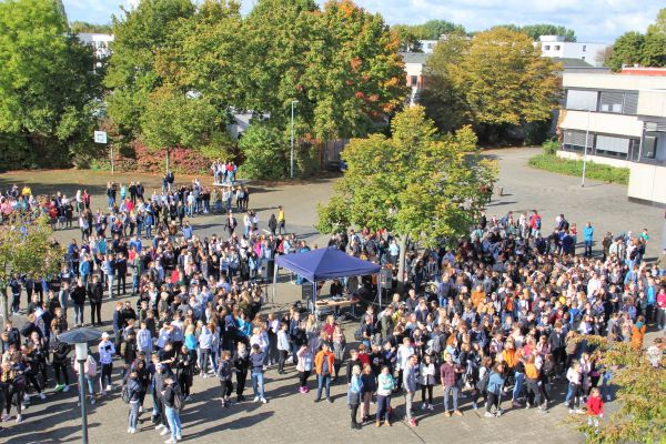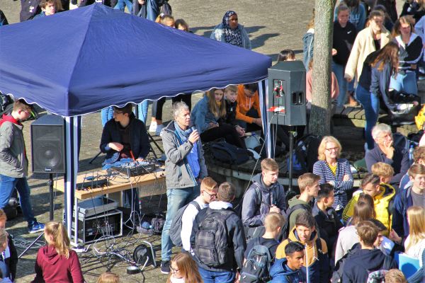 Herr Jürgensen-Engl moderierte das Spektakel vom Schulhof aus, Frau Goost gab vom Dach der Schule das Startsignal. |