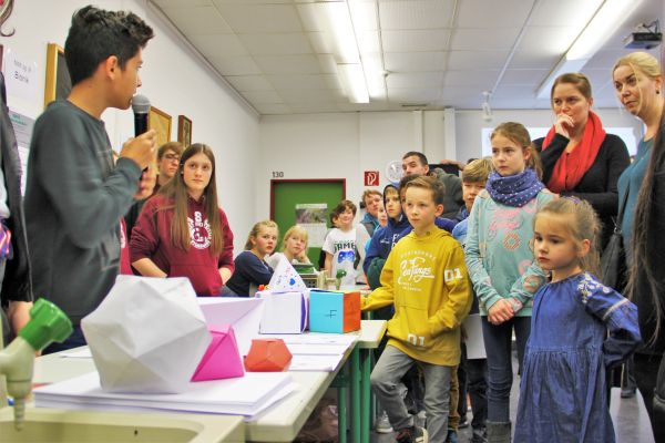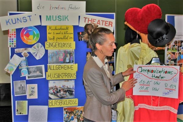Ganz unmittelbare Einblicke vermittelten die Führungen durch das Schulgebäude, die die Gäste in viele Räume, darunter auch die Schulbibliothek und diverse Naturwissenschaftsräume schauen ließen. Hier konnte man zudem spannende und verblüffende Experimente beobachten, die von Schülerinnen und Schülern durchgeführt wurden. Einen Eindruck vom künstlerischen Potenzial der Schule vermittelten die musikalische Einlage der Bläserklasse sowie die schauspielerische Darbietung des Improvisationstheaters.