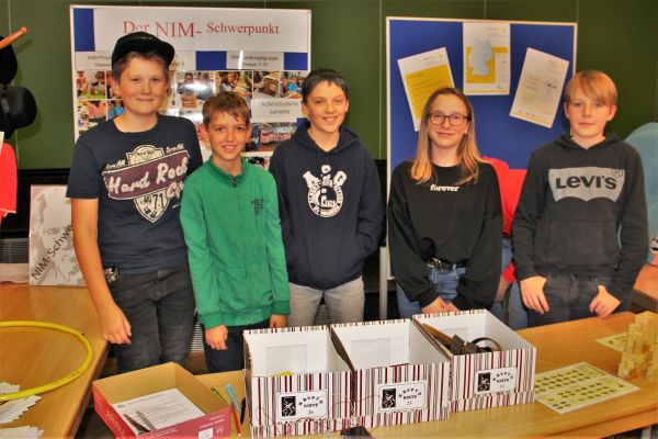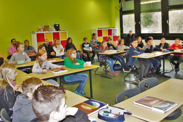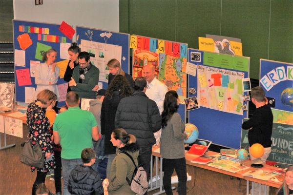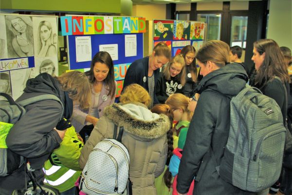 Besonders begehrt waren die Zutrittskarten zu den Unterrichtsstunden, an denen die Grundschülerinnen und -schüler gemeinsam mit ihren Eltern teilnehmen konnten. Nachdem der kommissarische Schulleiter Thorsten Jürgensen-Engl die Gäste begrüßt und ihnen die wichtigsten Informationen zum Ablauf des Tages mitgeteilt hatte, geleiteten Mädchen und Jungen der Erprobungsstufe die Grundschulkinder mit ihren Eltern in die Klassen, wo sie zum ersten Mal eine Schulstunde am Gymnasium miterlebten. Einen Eindruck von den verschiedenen Unterrichtsfächern konnte man aber auch an den Informationsständen in der Aula gewinnen, wo Lehrerinnen und Lehrer der Schule ihre Fächer anschaulich präsentierten. Außerdem gab es hier und im Foyer der Schule viel Informatives zu Projekten und Arbeitsgemeinschaften, die das Schulleben auch außerhalb des regulären Unterrichts bereichern. So konnten die Gäste unter anderem viel Interessantes über den deutsch-spanisch bilingualen Zweig, den NIM Schwerpunkt (Naturwissenschaften, Informatik, Mathematik), den Ganztag mit seinen zahlreichen Angeboten, die Inklusion und vieles andere mehr in Erfahrung bringen.
