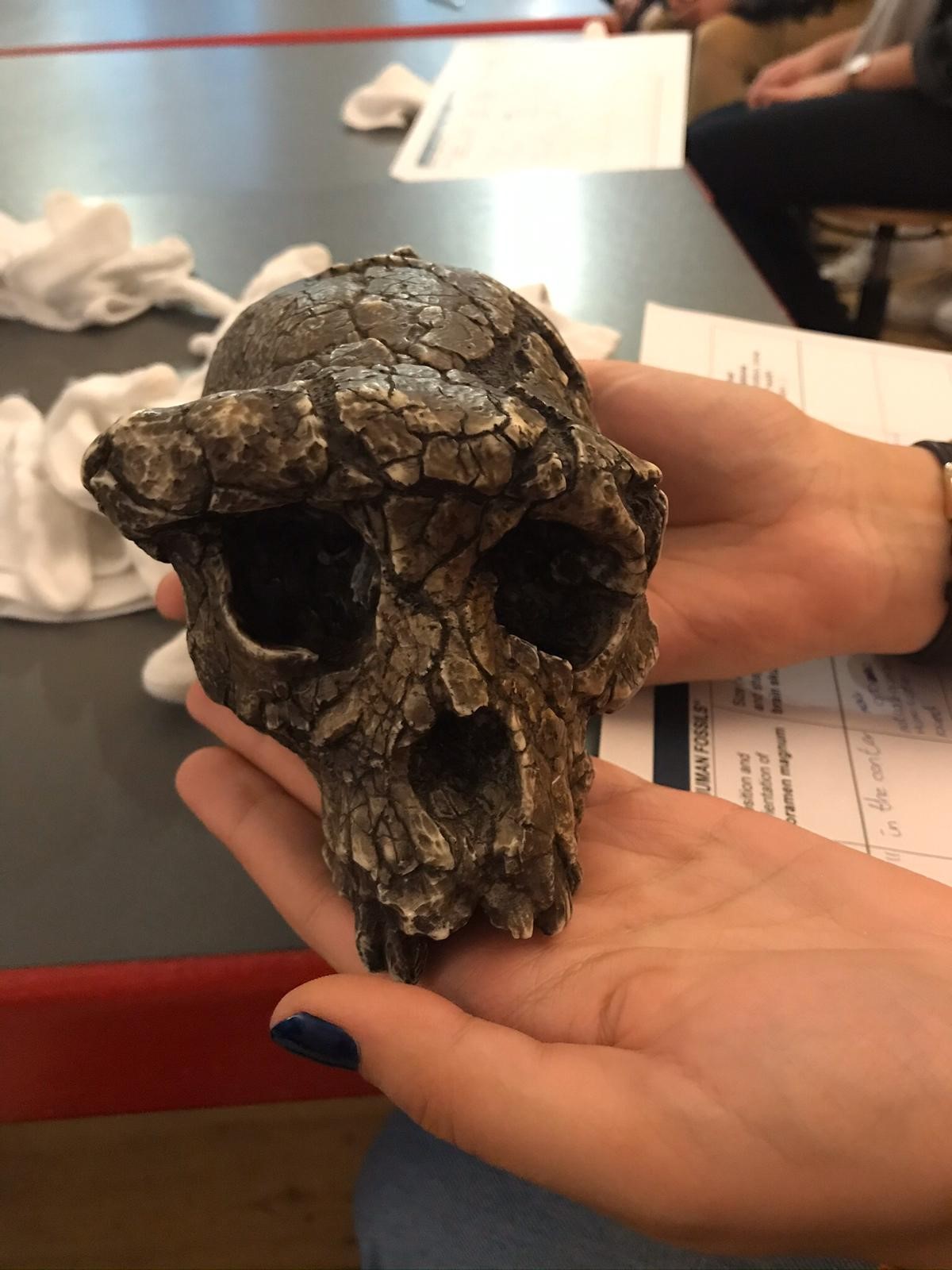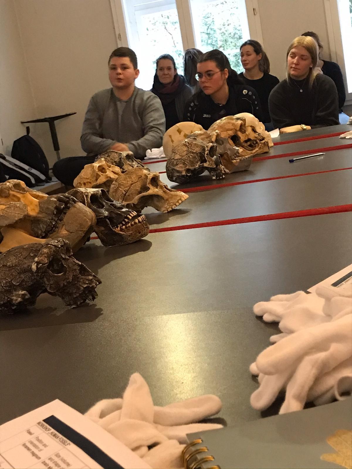 Wir vom bilingualen Biologie Kurs der Q1 haben uns zusammen mit unseren Austauschschülern aus Spijkennisse, einer Stadt am Rande Rotterdams, auf die Suche nach präzisen Antworten gemacht und landeten schlussendlich beim Neandertal Museum in Mettmann. Mit dabei waren unsere Lehrerinnen Frau Räcke und Frau Bösader und zwei weitere Lehrerinnen aus Spijkenisse. Im Museum selbst, führte uns eine für die menschliche Evolution begeisterte Frau, durch die Ausstellung und erklärte uns all die grundlegenden Informationen über die Entwicklung des Menschen. Zum einen lernten wir die verschiedenen Arten von Urmenschen und deren Lebensweisen kennen und sahen diese als fast schon echt erscheinenden Wachsfiguren vor uns. Zum anderen lernten wir Schädel und Zähne so zu untersuchen, dass wir feststellen konnten, wie der Urmensch gelebt hatte und ungefähr zu welcher Zeit. Nach der Führung galt es dieses Wissen nun unter Beweis zu stellen. Dafür begaben wir uns zu einem Gebäude etwas abseits des Museums und fanden uns alle in einem Raum umgeben mit Schädel-Skeletten wieder. Im nächsten Schritt teilten wir uns in Gruppen auf und begannen die Schädel von oben nach unten zu untersuchen, um zum Beispiel Anzeichen über die Gangart oder Ernährung des Urmenschen herauszufinden. Schlussendlich trugen wir unsere Ergebnisse, in einer offenen Runde vor und legte einen Zeitstrahl aus den Schädeln.
