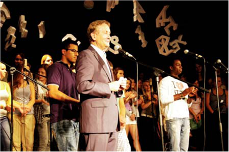 Zahlreiche Schülerinnen und Schüler der CertiLingua-Schulen aus dem Bereich der Bezirksregierungen Düsseldorf und Köln erschienen, begleitet von ihren Schulleitern oder CertiLingua-Koordinatoren, zur Verleihung des CertiLingua-Zertifikates am Albert-Schweitzer-Gymnasium. Zum Sektempfang im Foyer improvisierte David Goméz Stiefenhöfer am Klavier und anschließend sang der Oberstufenchor unter der Leitung von Frau Spielmanns “Summertimes”. Er wurde dabei von Herrn Grüner am Klavier begleitet. Pünktlich um 13.00 Uhr wurden die Gäste, unter denen sich auch der Bürgermeister der Stadt Hürth, Walther Boecker, befand, in die Aula eingelassen. Dort wurde die Veranstaltung von einem erneuten Auftritt des Oberstufenchors und der Big-Band mit dem Lied der Bläck Fööss “Jooden Daach” eingeleitet. Und dies auf drei Sprachen, nämlich Französisch, Spanisch und Kölsch!