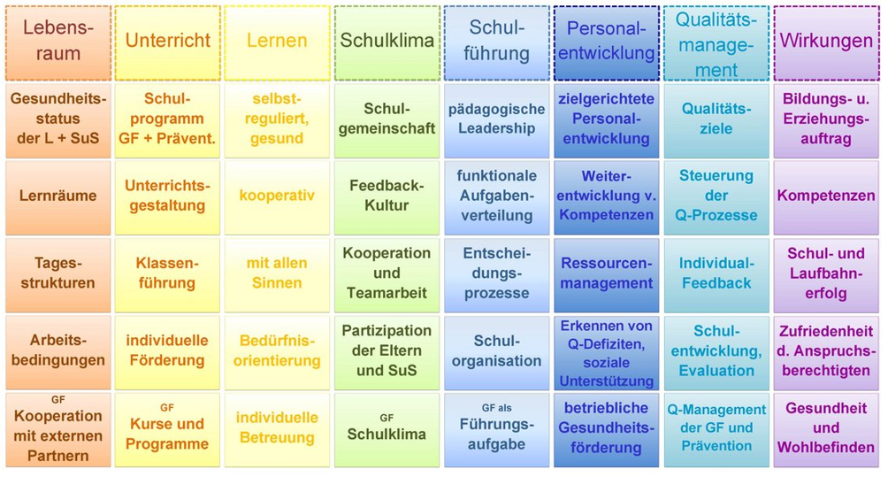 Die Gesundheitsförderung an unserer Schule soll sich am IQES-Qualitätstableau für die Qualitätsentwicklung und Selbstevaluation an Schulen orientieren, das die Mehrdimensionalität einer nachhaltigen Gesundheitsförderung darstellt: