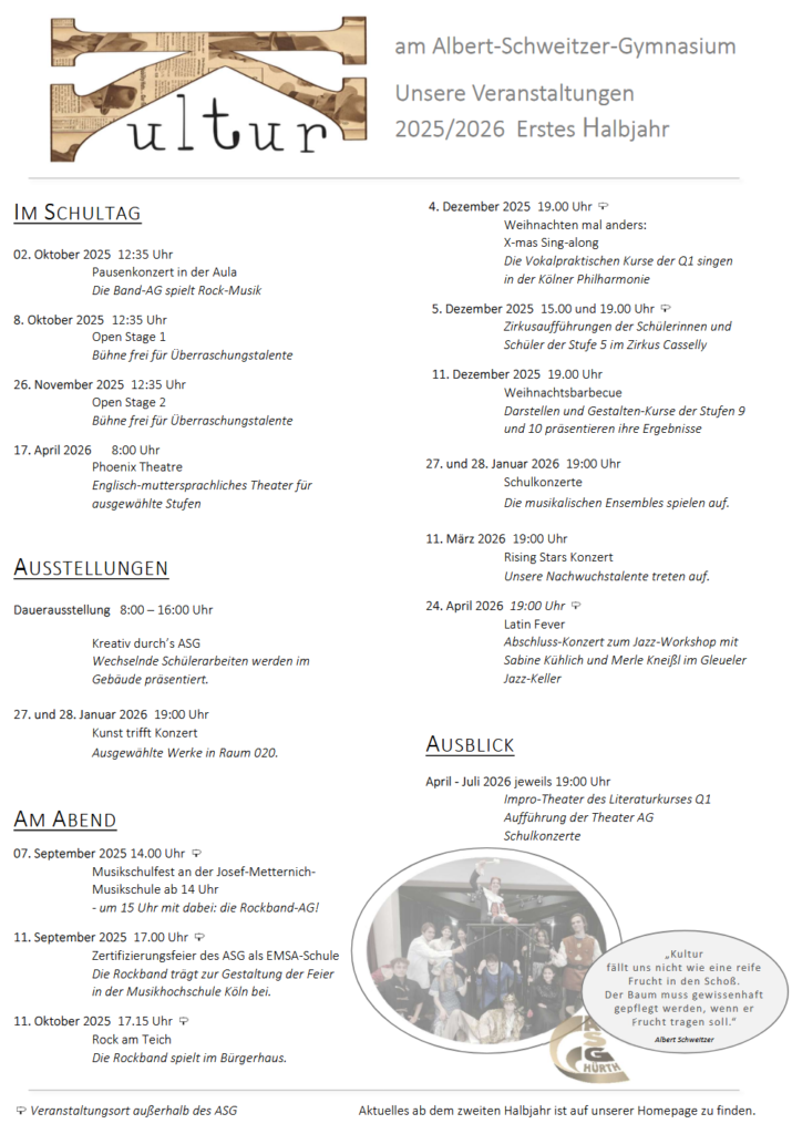 Die verschiedenen Bereiche des kulturellen Lebens bei uns am ASG stellen hier vor, was unser Schulleben über die Unterrichtsinhalte hinaus bereichert und wie wir gemeinsam „den Baum unserer Kultur“ pflegen.